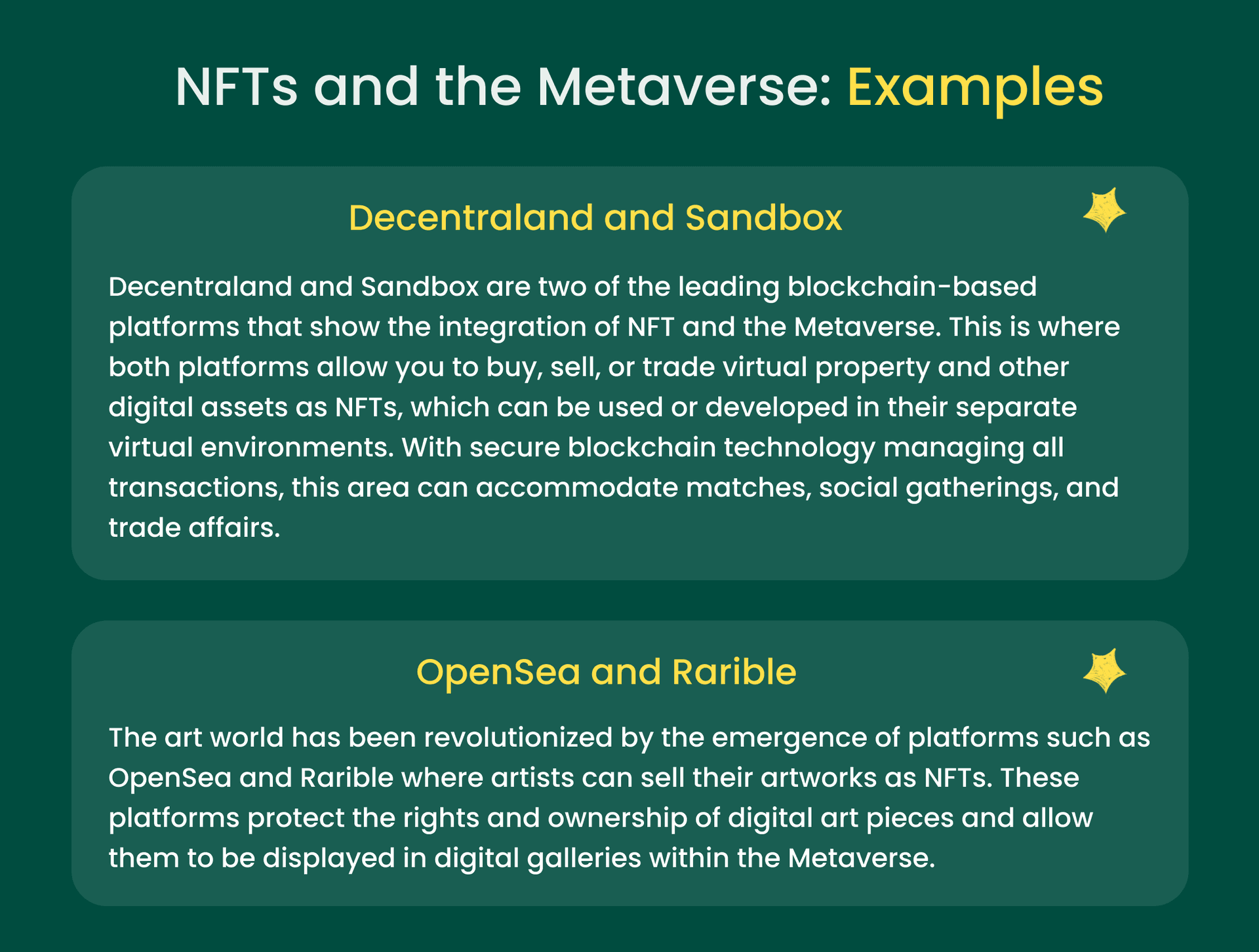 NFTs or digital assets are a means of proving to be the owner of the unique assets such as music, art, and virtual land of the Decentraland and the Sandbox metaverse platforms (read more about how to create an NFT marketplace). This integration blurs the line between the digital and traditional economy and, therefore, gives business people and curators many opportunities to profit from content and entertain global viewers who talk with each other in virtual media.