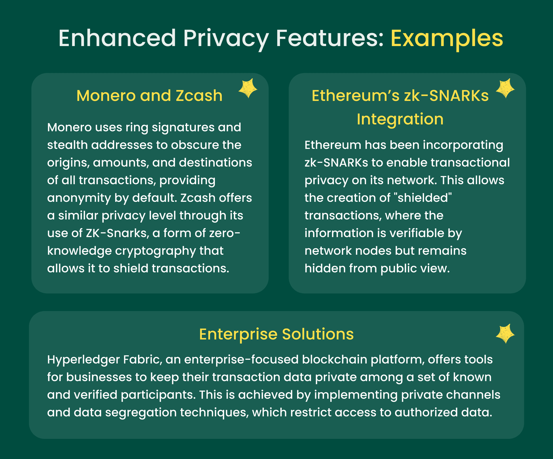 Private Transactions and Confidential Contracts: Some blockchains like Monero and Zcash offer enhanced privacy features by default, masking the identity of transactors and the amounts transferred. Similar functions are being introduced for several other platforms, including Ethereum, and users can decide when and how to expose transaction details.