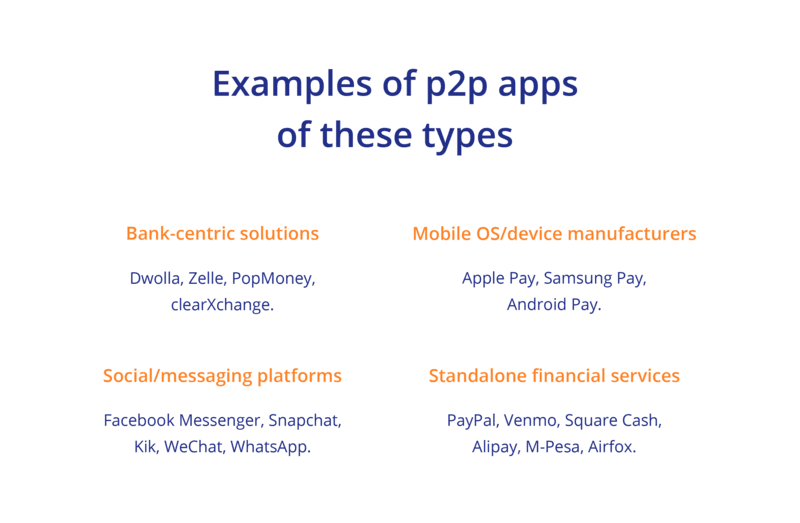 However, we'll be more interested in another version of the classification: one that helps us answer the question: “How to create a mobile peer-to-peer payment application?”. As you'll learn later, it's impossible to implement the development process without a preliminary analysis of existing solutions. Let's explore them.