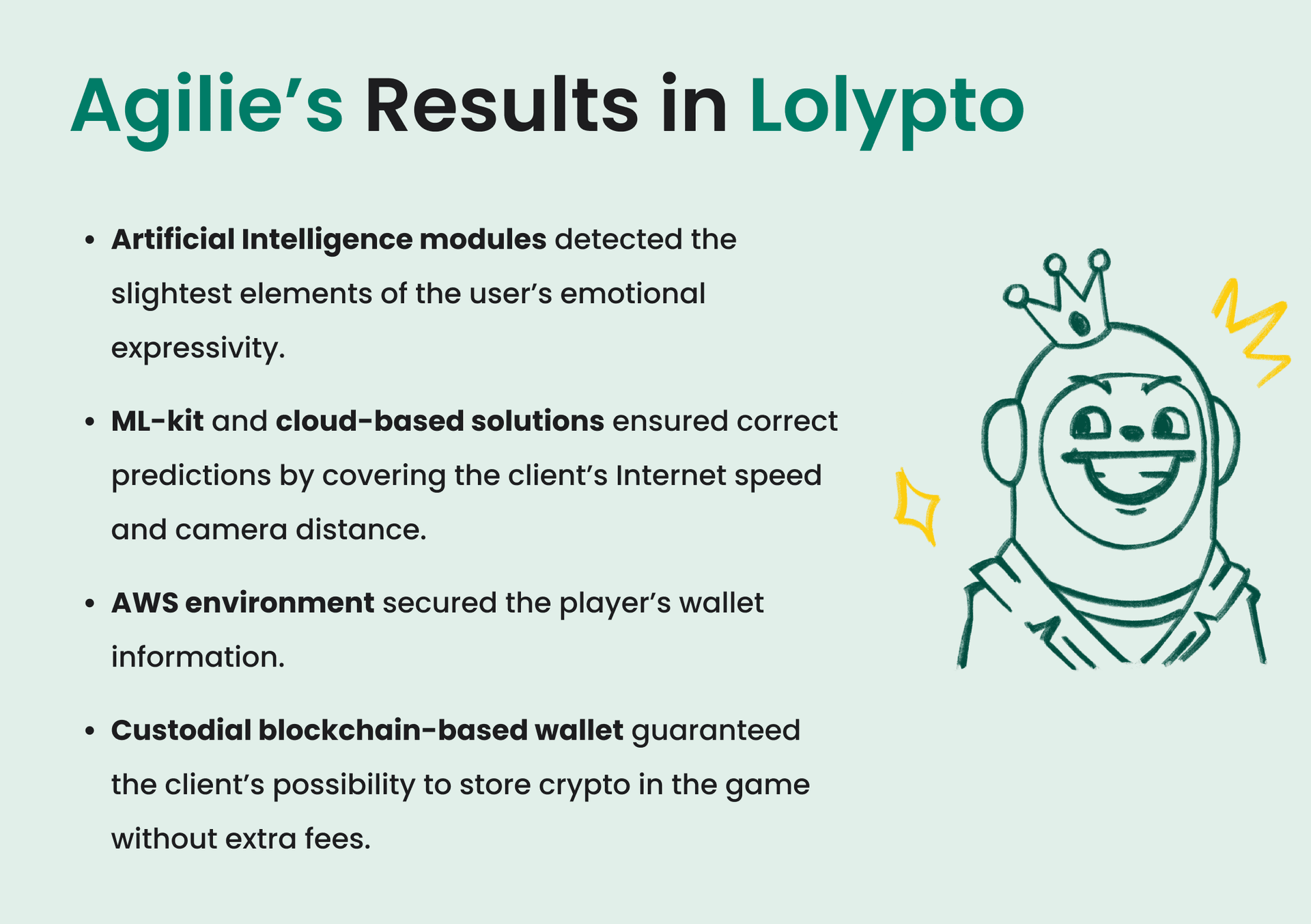 Fintech and AI are inseparable, considering the advantages it provides to optimizing banking and business operations. Risk management, big data analysis, predictions and security enhancement, represent the benefits of AI algorithms. Agile’s work with Lolypto demonstrated the mastery of integrating Artificial Intelligence into the NFT staking and social interactions. Emotional expressivity AI-driven recognition patterns, as combined with the Binance blockchain network, ensure game recognition and client’s wallet security. Interested in integrating AI into your product - join our journey.